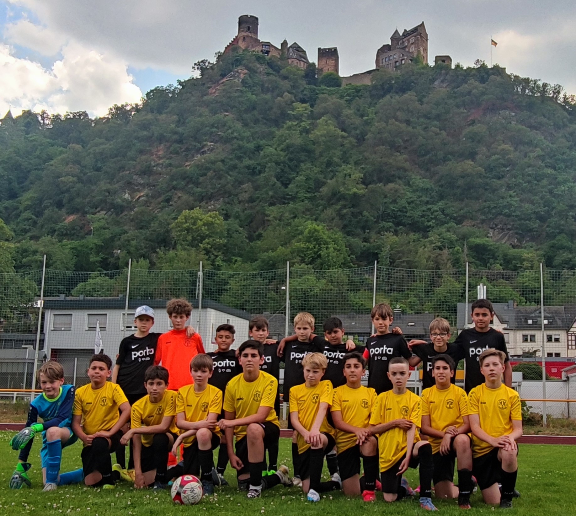Von langer Hand geplant, bricht die D2 am 10. Juni 23 auf große Fahrt nach Oberwesel auf. 19 Spieler von insgesamt 24 treten voll Vorfreude die Fahrt an. Nach ca. 1,5 Stunden mit dem Zug und 30 Minuten Fußmarsch bergauf nehmen die Jungs die Jugendherberge in Besitz. Erst einmal stärken sie sich mit einem Mittagessen und lernen die Umgebung kennen, wobei sich insbesondere die Kleinkinder-Rutsche überraschend als Attraktion erweist. Nun heißt es, fertig machen für´s Fussball spielen. Unser Gastgeber, die Vesalia Oberwesel, hat kurzfristig ein Mini-Turnier zusammengestellt, so dass wir zwei Mannschaften stellen, Oberwesel zwei und Hunsrück Nord eine Mannschaft. Den ganzen Nachmittag spielten die Jungs auf ungewohntem Naturrasen im Rhinelander Satdion (immerhin besser als Asche wie eine Woche zuvor beim Turnier bei der Hertha, wo wir aber ebenfalls mit zwei Mannschaften spielten und die hervorragenden Plätze 2 und 4 belegen konnten). Unsere erste Mannschaft schafft es, punktgleich mit Oberwesel…