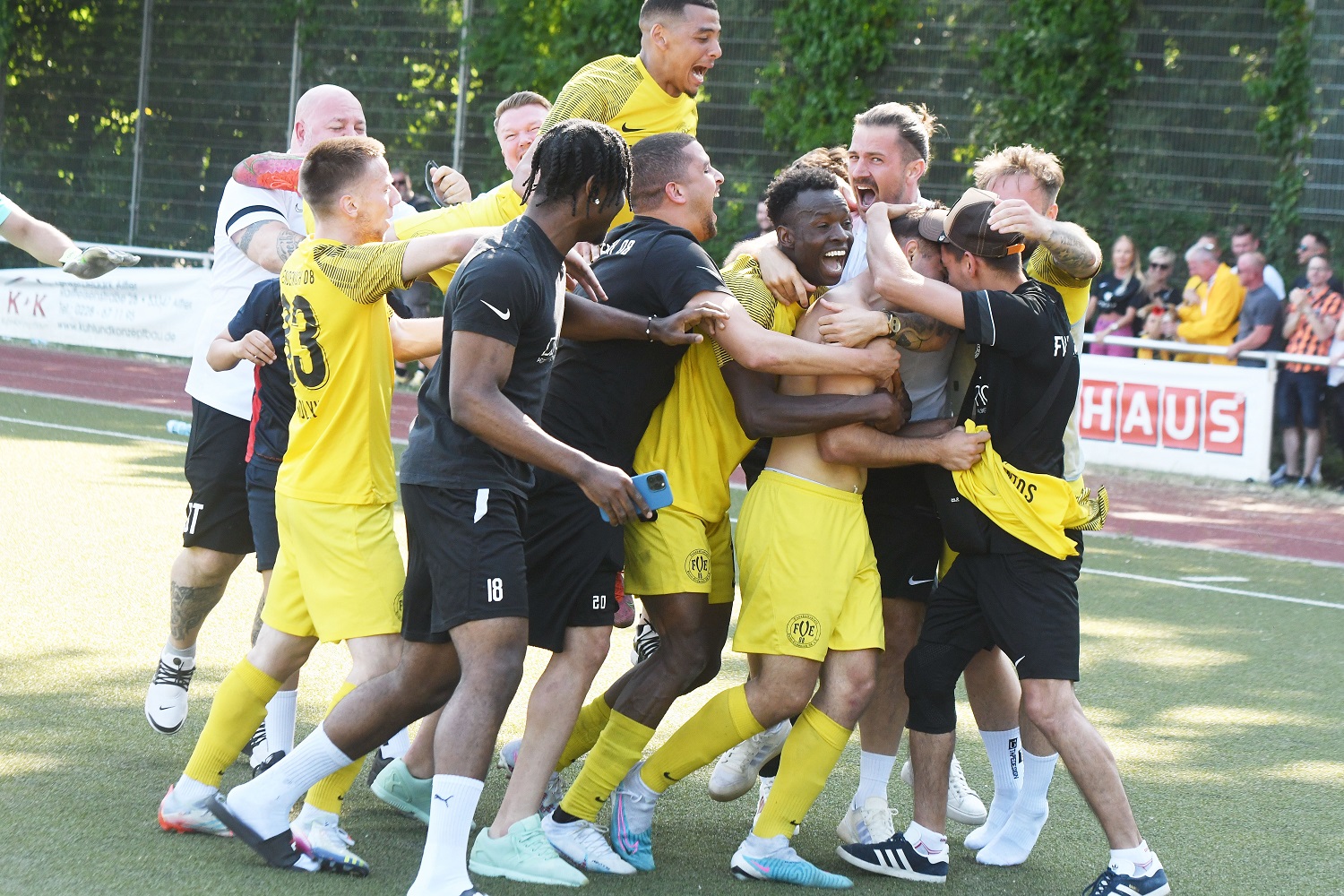 Durch einen 3:0 Erfolg gegen den VfL Alfter hat die 1. Herrenmannschaft des FVE am vergangenen Wochenende den Aufstieg in die Mittelrheinliga und damit fünfthöchste Spielklasse geschafft. Die Jugendabteilung gratuliert der gesamten Seniorenabteilung, insbesondere den Spielern und Trainern der ersten Mannschaft, zu dieser grandiosen Leistung. Damit spielt der FVE in der nächsten Saison mit seiner 1. Herrenmannschaft in einer Liga z. B. mit dem Bonner SC. Absolut großartig! Auch gratulieren wir der 3. Herrenmannschaft zum Aufstieg in die Kreisliga B nachdem man erst im Vorjahr in die Kreisliga C aufgestiegen war.